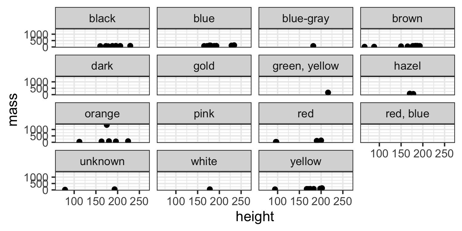 class: center, middle, inverse, title-slide # Data and visualization ### Prof. Maria Tackett --- layout: true <div class="my-footer"> <span> <a href="http://datasciencebox.org" target="_blank">datasciencebox.org</a> </span> </div> --- class: middle, center ## [Click for PDF of slides](03-data-and-viz.pdf) --- class: center, middle # Exploratory data analysis --- ## What is EDA? - .vocab[Exploratory data analysis (EDA)] is an approach to analyzing data sets to summarize the main characteristics. <br> - Often, EDA is visual. That's what we're focusing on today. <br> - We can also calculate summary statistics and perform data wrangling/manipulation/transformation at (or before) this stage of the analysis. --- class: center, middle # Data visualization --- ## Data visualization > *"The simple graph has brought more information to the data analyst’s mind than any other device." — John Tukey* <br> - .vocab[Data visualization] is the creation and study of the visual representation of data. <br> - There are many tools for visualizing data (R is one of them), and many approaches/systems within R for making data visualizations - We'll use **`ggplot2`**. --- ## ggplot2 in tidyverse .pull-left[ <img src="img/03/ggplot2-part-of-tidyverse.png" width="70%" /> ] .pull-right[ - **ggplot2** is tidyverse's data visualization package - The `gg` in "ggplot2" stands for Grammar of Graphics - It is inspired by the book **Grammar of Graphics** by Leland Wilkinson*  ] .footnote[ Source: [BloggoType](http://bloggotype.blogspot.com/2016/08/holiday-notes2-grammar-of-graphics.html) ] --- ## What is a Grammar of Graphics? A tool that allows for concisely describing the components of a graphic: <img src="img/03/grammar-of-graphics.png" width="70%" style="display: block; margin: auto;" /> --- ## What function is doing the plotting? ```r ggplot(data = starwars, mapping = aes(x = height, y = mass)) + * geom_point() + labs(title = "Mass vs. height of Starwars characters", x = "Height (cm)", y = "Weight (kg)") ``` ``` ## Warning: Removed 28 rows containing missing values (geom_point). ``` <img src="03-data-and-viz_files/figure-html/unnamed-chunk-4-1.png" style="display: block; margin: auto;" /> --- ## What is the dataset being plotted? ```r *ggplot(data = starwars, mapping = aes(x = height, y = mass)) + geom_point() + labs(title = "Mass vs. height of Starwars characters", x = "Height (cm)", y = "Weight (kg)") ``` ``` ## Warning: Removed 28 rows containing missing values (geom_point). ``` <img src="03-data-and-viz_files/figure-html/unnamed-chunk-5-1.png" style="display: block; margin: auto;" /> --- ## Which variable is on the x-axis? On the y-axis? ```r *ggplot(data = starwars, mapping = aes(x = height, y = mass)) + geom_point() + labs(title = "Mass vs. height of Starwars characters", x = "Height (cm)", y = "Weight (kg)") ``` ``` ## Warning: Removed 28 rows containing missing values (geom_point). ``` <img src="03-data-and-viz_files/figure-html/unnamed-chunk-6-1.png" style="display: block; margin: auto;" /> --- ## What does the warning mean? ```r ggplot(data = starwars, mapping = aes(x = height, y = mass)) + geom_point() + labs(title = "Mass vs. height of Starwars characters", x = "Height (cm)", y = "Weight (kg)") ``` ``` ## Warning: Removed 28 rows containing missing values (geom_point). ``` <img src="03-data-and-viz_files/figure-html/unnamed-chunk-7-1.png" style="display: block; margin: auto;" /> --- ## What does `geom_smooth()` do? ```r ggplot(data = starwars, mapping = aes(x = height, y = mass)) + geom_point() + * geom_smooth() + labs(title = "Mass vs. height of Starwars characters", x = "Height (cm)", y = "Weight (kg)") ``` <img src="03-data-and-viz_files/figure-html/unnamed-chunk-8-1.png" style="display: block; margin: auto;" /> --- ## Hello ggplot2! - `ggplot()` is the main function in ggplot2 and plots are constructed in layers - The structure of the code for plots can often be summarized as ```r ggplot + geom_xxx ``` <br> -- or, more precisely .small[ ```r ggplot(data = [dataset], mapping = aes(x = [x-variable], y = [y-variable])) + geom_xxx() + other options ``` ] --- ## Hello ggplot2! To use ggplot2 functions, first load tidyverse ```r library(tidyverse) ``` For help with the ggplot2, see [ggplot2.tidyverse.org](http://ggplot2.tidyverse.org/) --- class: center, middle # Visualizing Star Wars --- ## Dataset terminology .small[ ```r starwars ``` ``` ## # A tibble: 87 x 14 ## name height mass hair_color skin_color eye_color birth_year sex gender ## <chr> <int> <dbl> <chr> <chr> <chr> <dbl> <chr> <chr> ## 1 Luke… 172 77 other fair blue 19 male mascu… ## 2 C-3PO 167 75 none gold yellow 112 none mascu… ## 3 R2-D2 96 32 none white, bl… red 33 none mascu… ## 4 Dart… 202 136 none white yellow 41.9 male mascu… ## 5 Leia… 150 49 brown light brown 19 fema… femin… ## 6 Owen… 178 120 brown light blue 52 male mascu… ## 7 Beru… 165 75 brown light blue 47 fema… femin… ## 8 R5-D4 97 32 none white, red red NA none mascu… ## 9 Bigg… 183 84 black light brown 24 male mascu… ## 10 Obi-… 182 77 other fair blue-gray 57 male mascu… ## # … with 77 more rows, and 5 more variables: homeworld <chr>, species <chr>, ## # films <list>, vehicles <list>, starships <list> ``` ] Each row is an .vocab[observation]. Each column is a .vocab[variable] --- ## Luke Skywalker  --- ## What's in the Star Wars data? Take a `glimpse` of the data: ```r glimpse(starwars) ``` ``` ## Rows: 87 ## Columns: 14 ## $ name <chr> "Luke Skywalker", "C-3PO", "R2-D2", "Darth Vader", "Leia O… ## $ height <int> 172, 167, 96, 202, 150, 178, 165, 97, 183, 182, 188, 180, … ## $ mass <dbl> 77.0, 75.0, 32.0, 136.0, 49.0, 120.0, 75.0, 32.0, 84.0, 77… ## $ hair_color <chr> "other", "none", "none", "none", "brown", "brown", "brown"… ## $ skin_color <chr> "fair", "gold", "white, blue", "white", "light", "light", … ## $ eye_color <chr> "blue", "yellow", "red", "yellow", "brown", "blue", "blue"… ## $ birth_year <dbl> 19.0, 112.0, 