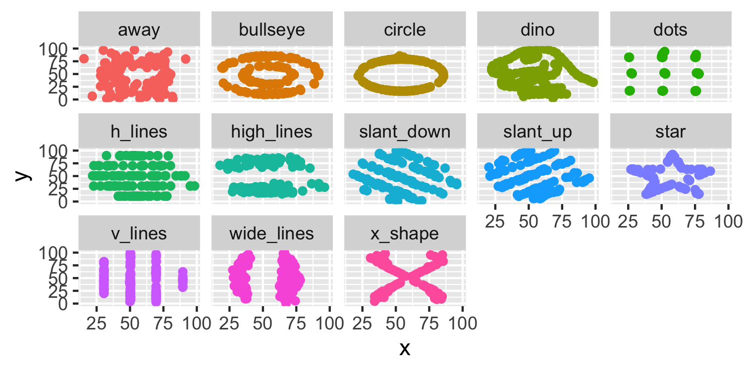 ## # A tibble: 13 x 2## dataset r## <chr> <dbl>## 1 away -0.0641## 2 bullseye -0.0686## 3 circle -0.0683## 4 dino -0.0645## 5 dots -0.0603## 6 h_lines -0.0617## 7 high_lines -0.0685## 8 slant_down -0.0690## 9 slant_up -0.0686## 10 star -0.0630## 11 v_lines -0.0694## 12 wide_lines -0.0666## 13 x_shape -0.0656