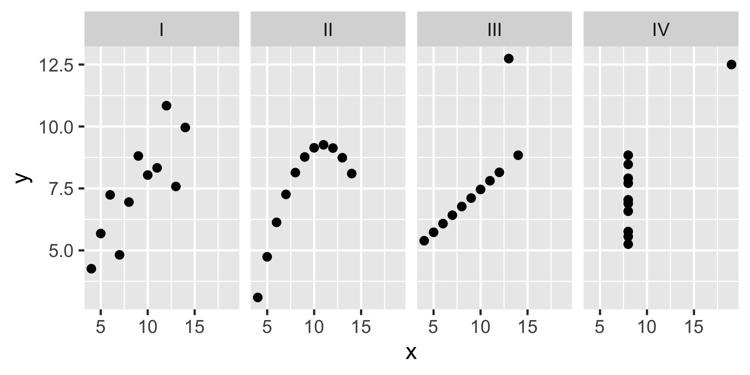 ## # A tibble: 4 x 6## set mean_x mean_y sd_x sd_y r## <fct> <dbl> <dbl> <dbl> <dbl> <dbl>## 1 I 9 7.50 3.32 2.03 0.816## 2 II 9 7.50 3.32 2.03 0.816## 3 III 9 7.5 3.32 2.03 0.816## 4 IV 9 7.50 3.32 2.03 0.817