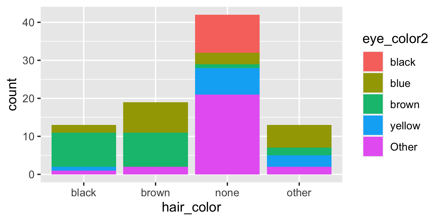 ggplot(data = starwars, mapping = aes(x = hair_color, fill = eye_color2)) + geom_bar()