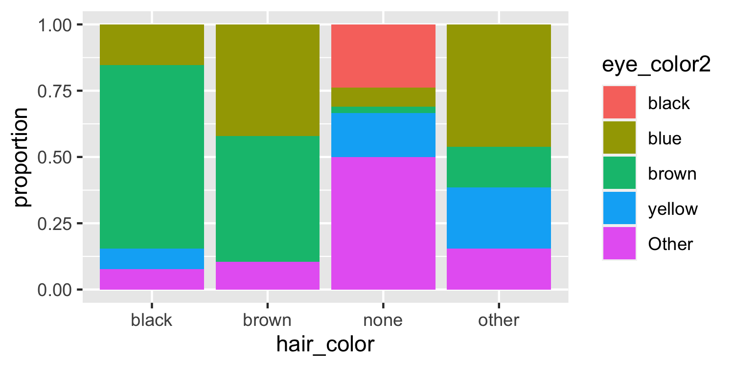 ggplot(data = starwars, mapping = aes(x = hair_color, fill = eye_color2)) + geom_bar(position = "fill") + labs(y = "proportion")