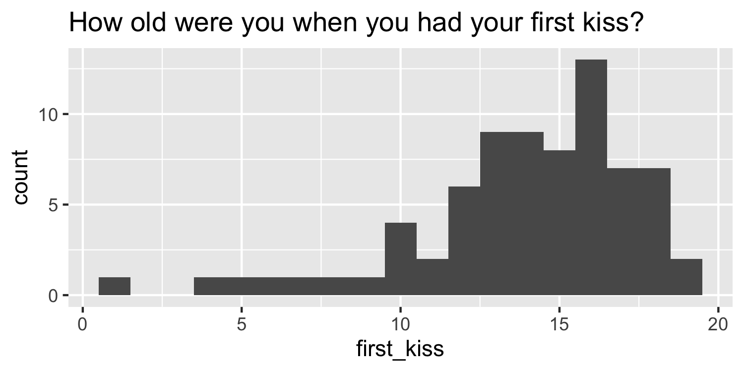 ggplot(student_survey, aes(x = first_kiss)) + geom_histogram(binwidth = 1) + labs(title = "How old were you when you had your first kiss?")