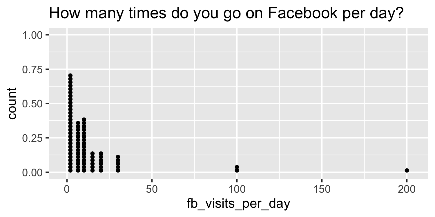 ggplot(student_survey, aes(x = fb_visits_per_day)) + geom_dotplot(binwidth = 5, dotsize = 0.4) + labs(title = "How many times do you go on Facebook per day?")