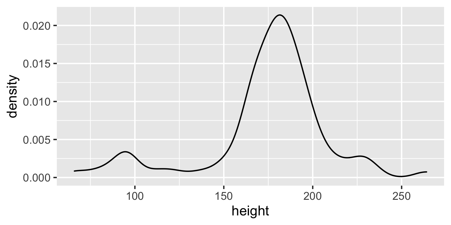 ggplot(data = starwars, mapping = aes(x = height)) + geom_density()