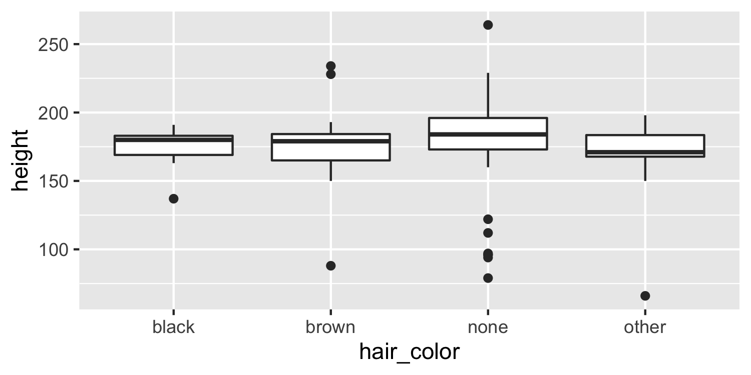 ggplot(data = starwars, mapping = aes(y = height, x = hair_color)) + geom_boxplot()
