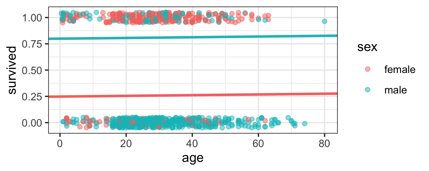 lm_survival <- lm(survived ~ age + sex, data = titanic)tidy(lm_survival)