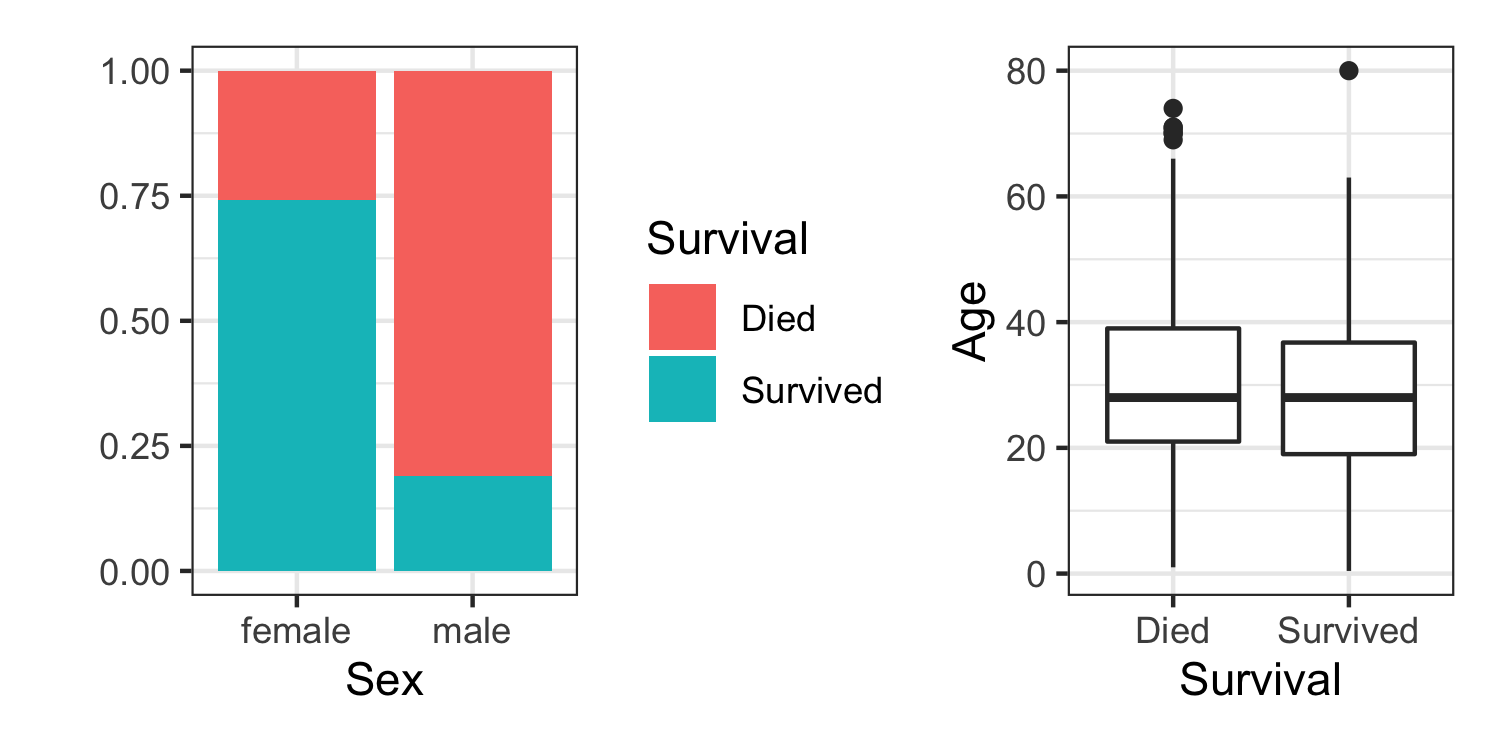 ## Rows: 887## Columns: 7## $ pclass <dbl> 3, 1, 3, 1, 3, 3, 1, 3, 3, 2, 3, 1, 3, 3, 3, 2, 3, 2, 3, 3, …## $ name <chr> "Mr. Owen Harris Braund", "Mrs. John Bradley (Florence Brigg…## $ sex <chr> "male", "female", "female", "female", "male", "male", "male"…## $ age <dbl> 22, 38, 26, 35, 35, 27, 54, 2, 27, 14, 4, 58, 20, 39, 14, 55…## $ fare <dbl> 7.2500, 71.2833, 7.9250, 53.1000, 8.0500, 8.4583, 51.8625, 2…## $ died <dbl> 1, 0, 0, 0, 1, 1, 1, 1, 0, 0, 0, 0, 1, 1, 1, 0, 1, 0, 1, 0, …## $ survived <dbl> 0, 1, 1, 1, 0, 0, 0, 0, 1, 1, 1, 1, 0, 0, 0, 1, 0, 1, 0, 1, …