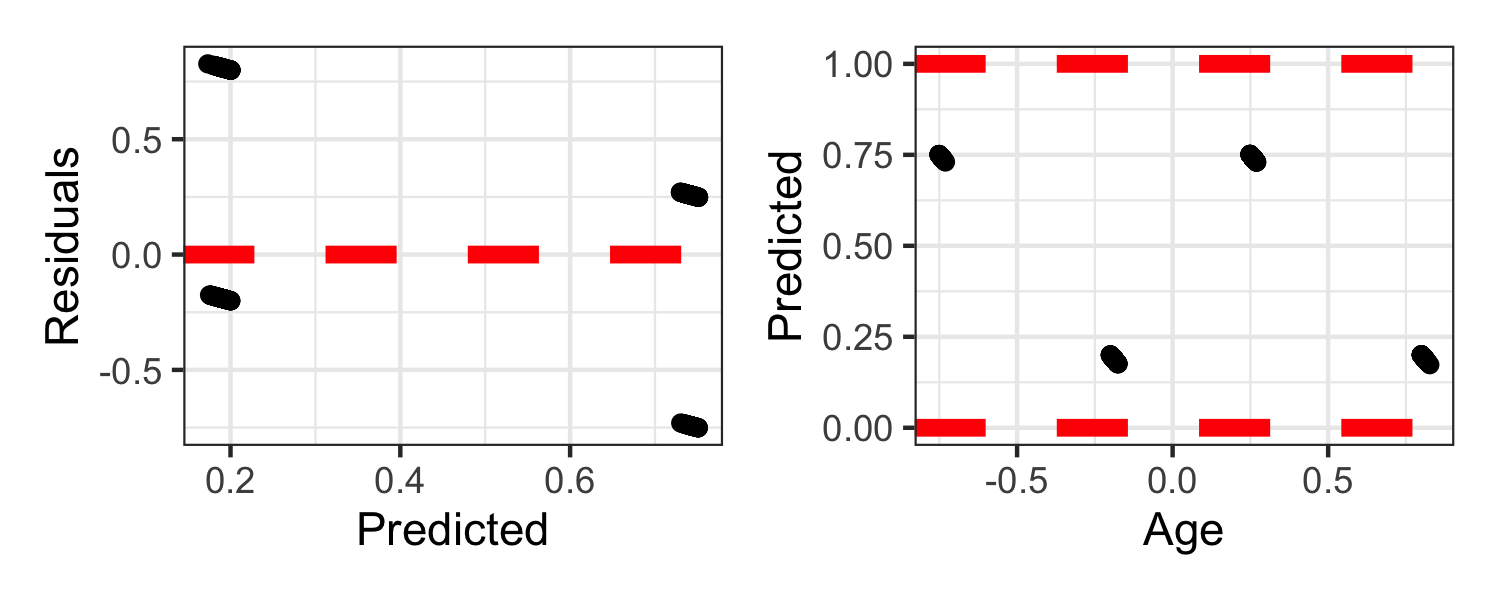 ## # A tibble: 3 x 5## term estimate std.error statistic p.value## <chr> <dbl> <dbl> <dbl> <dbl>## 1 (Intercept) 1.11 0.208 5.34 9.05e- 8## 2 sexmale -2.50 0.168 -14.9 3.24e-50## 3 age -0.00206 0.00586 -0.351 7.25e- 1log(ˆp1−ˆp)=1.11−2.50 sex−0.00206 age